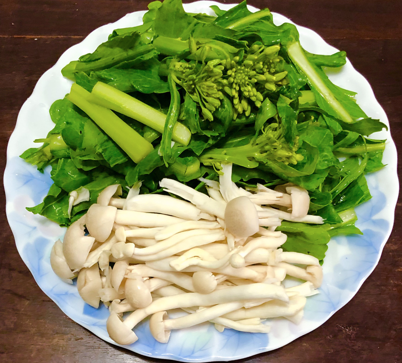材料:芥藍菜、長腿菇、薑、糖、鹽、料酒。