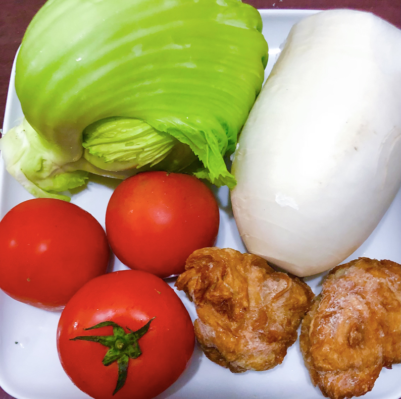 材料:白蘿蔔、番茄、芥菜、炸麵筋球、薑片。