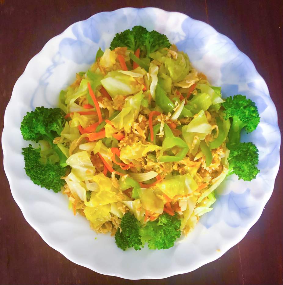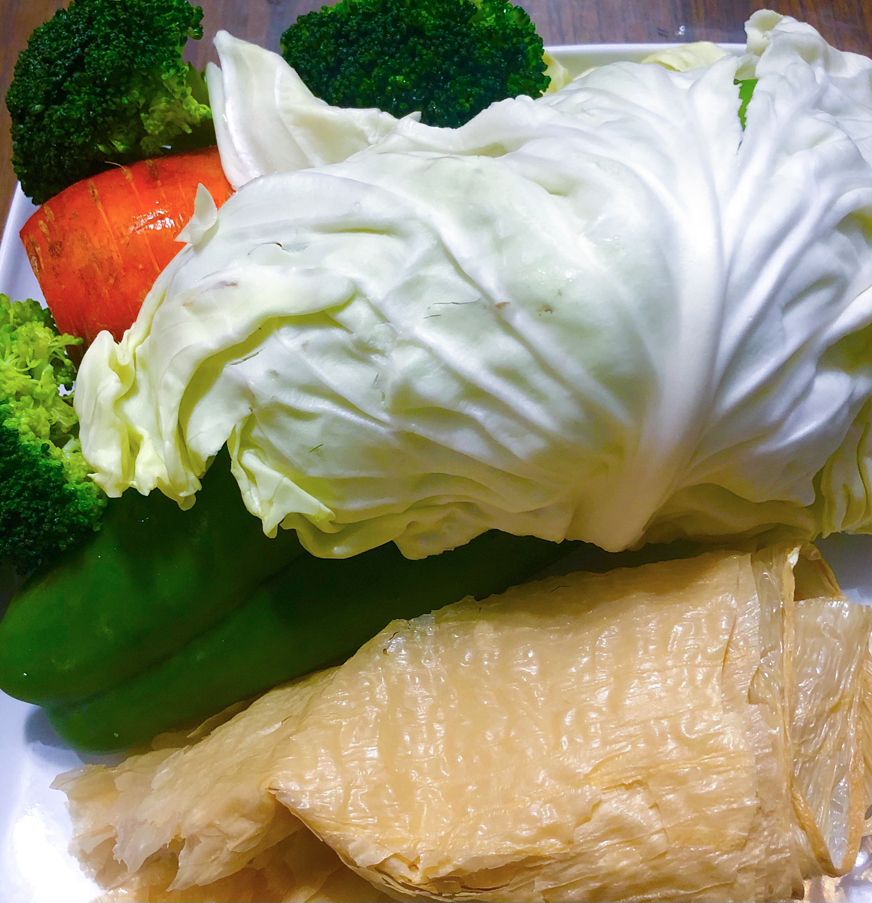 材料:髙麗菜、豆皮、青椒、紅蘿蔔、綠花椰菜。