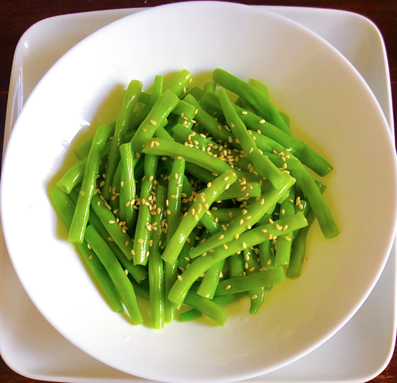 作法:先將大碗內放入橄欖油或香油備用,再將四季豆洗淨去頭尾再切兩段放入滾水中,燙熟後撈出倒入已備好調料的大碗中翻拌入味即可盛起,倒入盤中撒上白芝麻即可。