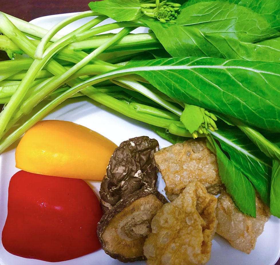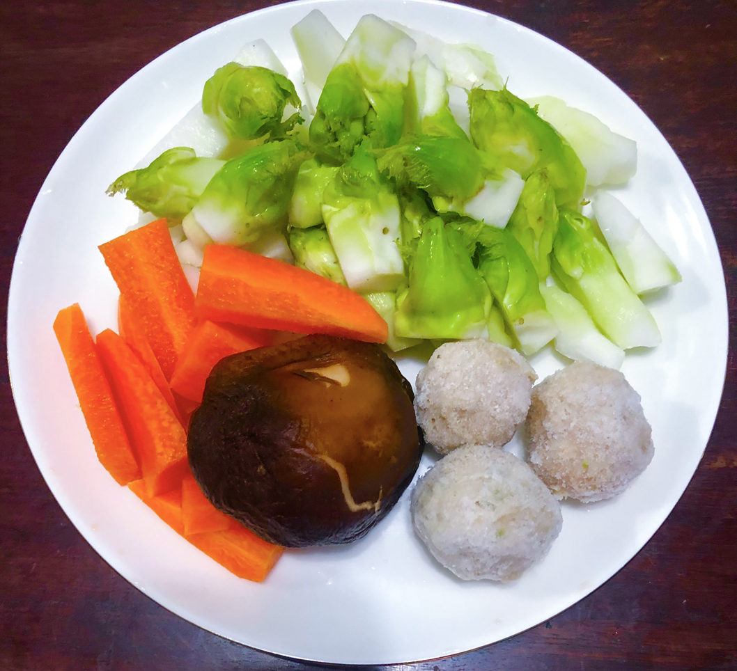 材料:娃娃菜、香菇、素丸子、紅蘿蔔、胡椒鹽、薑。