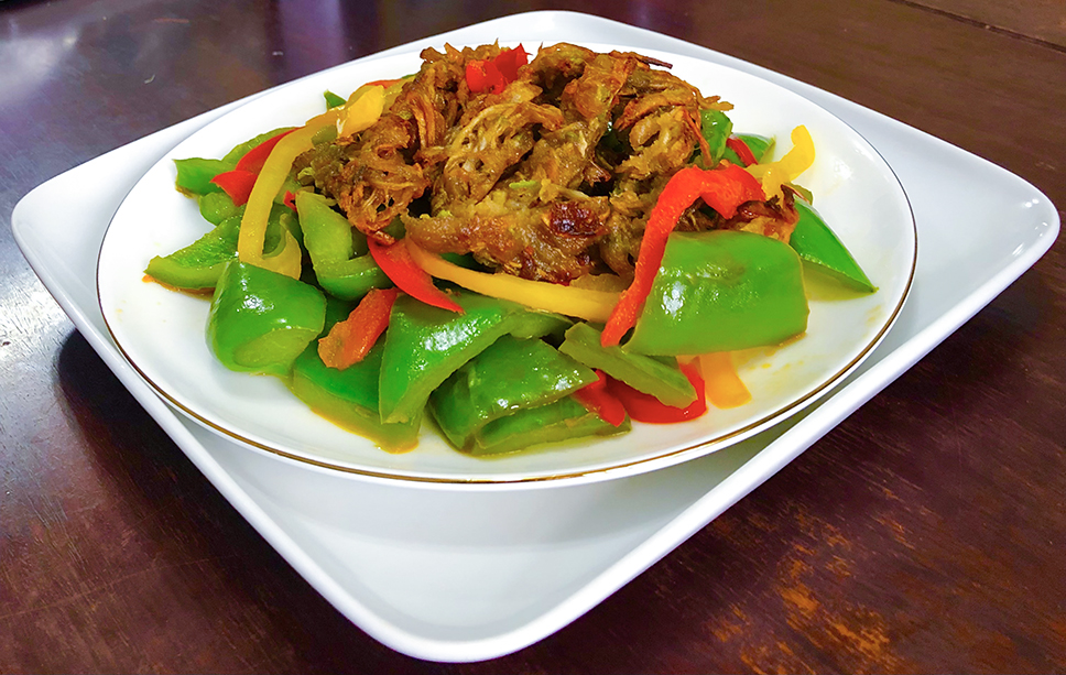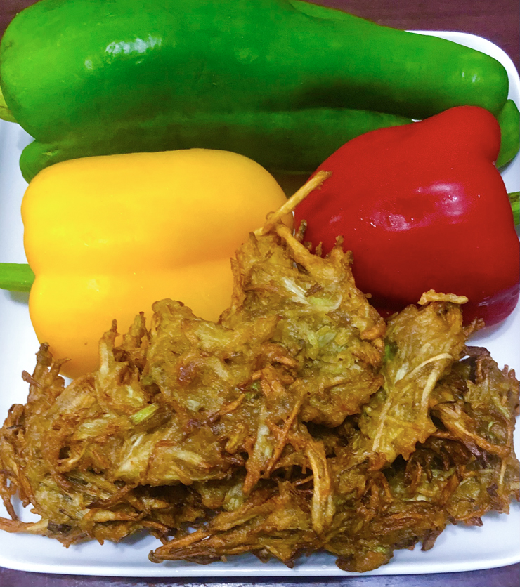 作法:彩椒洗淨,青椒切小滾刀,紅黃椒切絲,鍋內放油下青椒+鹽及少許薄醬油炒香+少許水煮一下再加紅黃椒拌炒入味起鍋倒入盤中,把牛蒡餅在鍋內用小火煎香,舖在彩椒撒上胡椒粉即可。