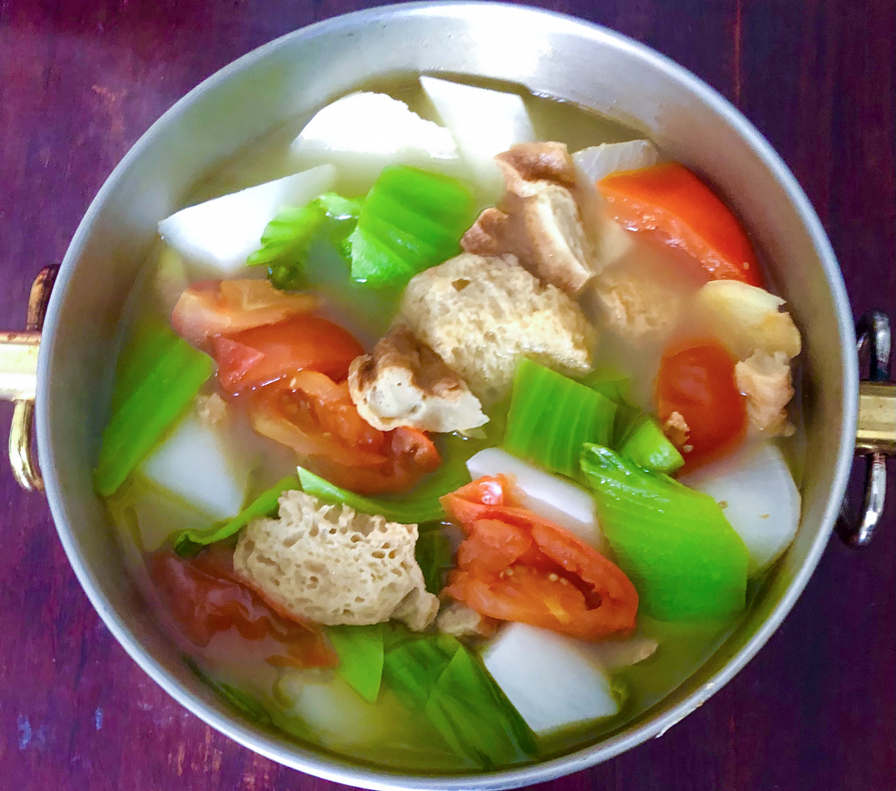 作法:鍋內放水下白蘿蔔,薑片煮至白蘿蔔 5 分熟+芥菜+番茄+麵筋球 (撕塊)+鹽,燉至芥菜熟即可。