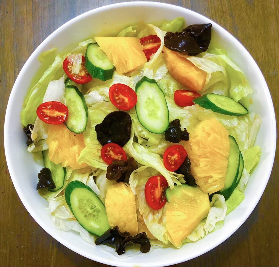 材料:萵苣、小番茄、小黃瓜、鳯梨、木耳、烏醋、亜麻仁油。