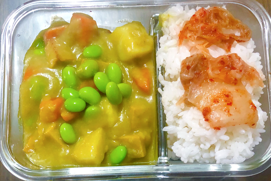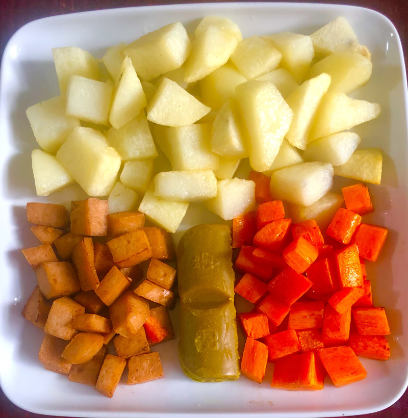 材料:馬鈴薯、紅蘿蔔、素火腿、素食咖哩、毛豆。