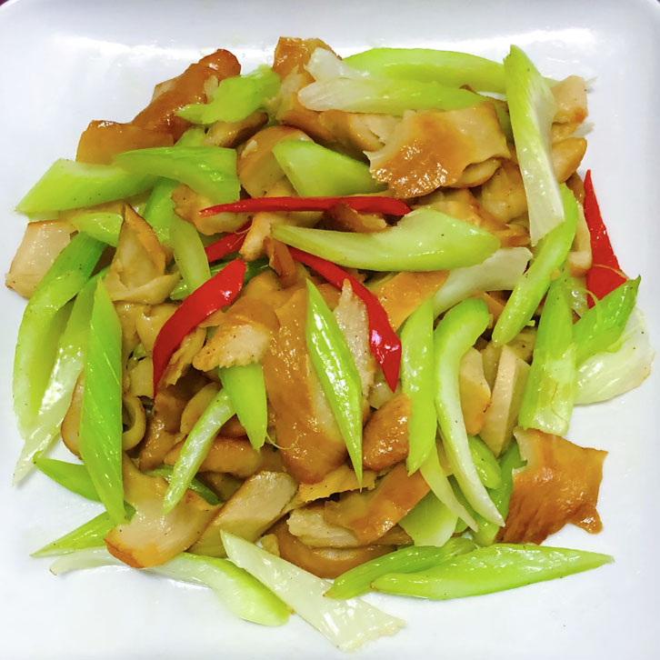 作法:先將西芹洗淨去切斜片川燙備用,燻麵腸切斜片,薑切片,鍋內放少許油下燻麵腸炒香盛起,再放少許油把川燙過的西芹下鍋+辣椒炒香再倒入燻麵腸一起拌炒+胡椒鹽即可。