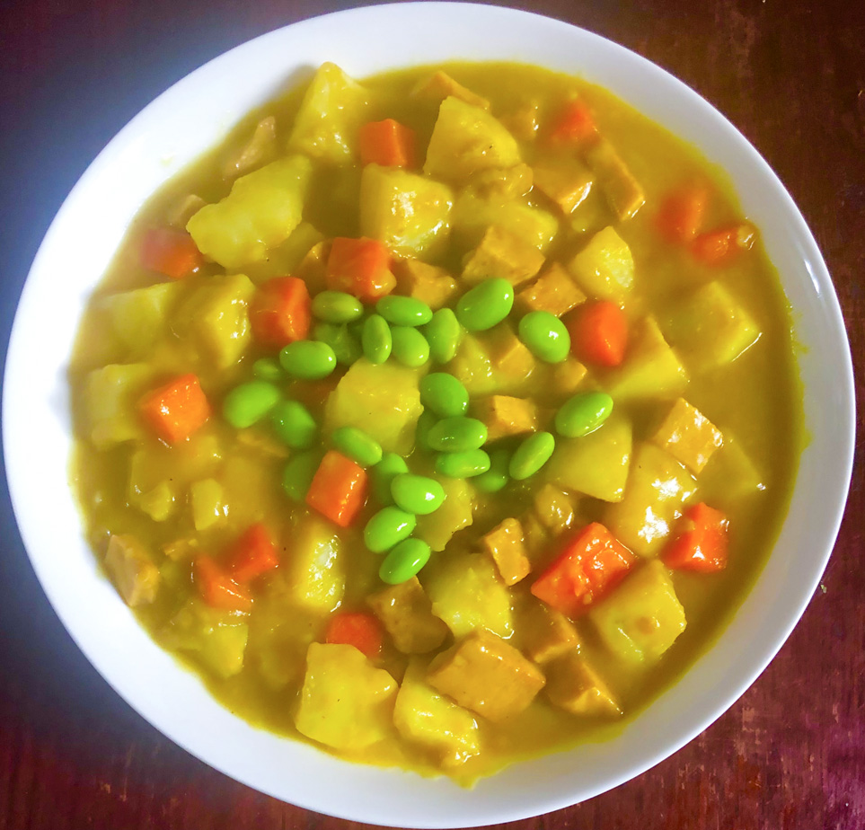 作法:先將毛豆川燙,馬鈴薯去皮切大丁,紅蘿蔔切小丁,素火腿切丁各自分別炸香 (煎香) 盛盤中備用。咖哩切小塊放入鍋中,將炸好的料一起倒入鍋中炒香,加水蓋過面多些煮滾攪拌均勻撒上毛豆即可。
