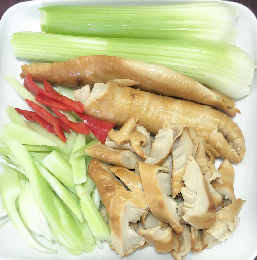 材料:西芹、燻麵腸、紅辣椒、薑。