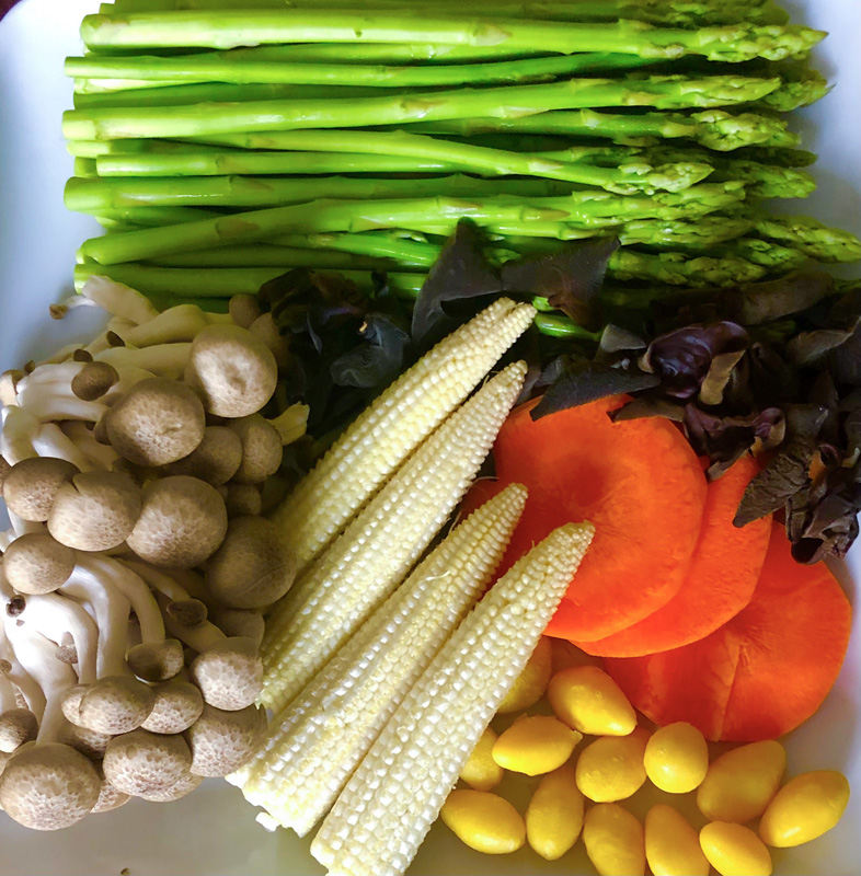 材料:蘆筍、玉米筍、銀杏、紅蘿蔔、木耳、新鮮菇。