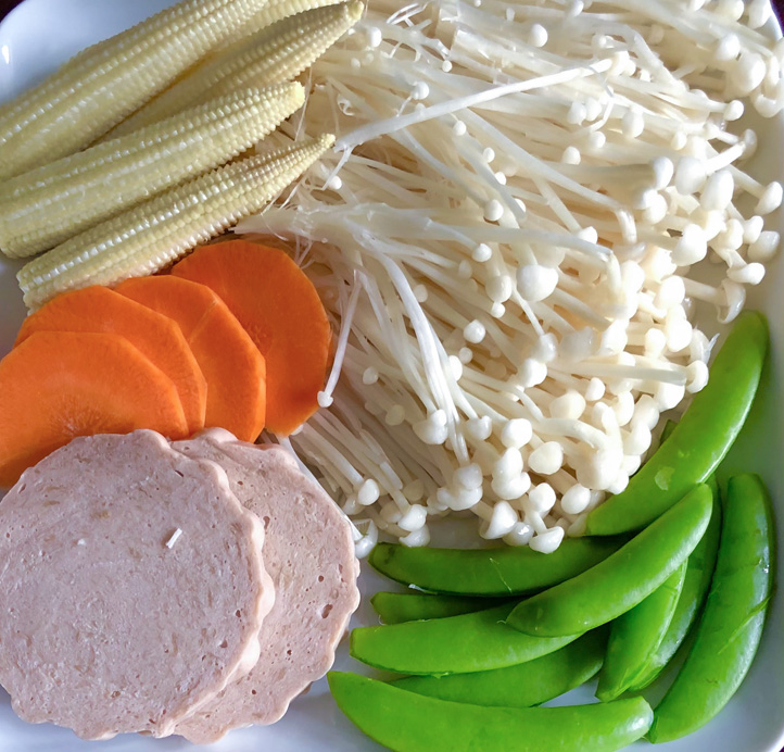 材料:金針菇、素火腿、紅蘿蔔、玉米筍、甜豆。