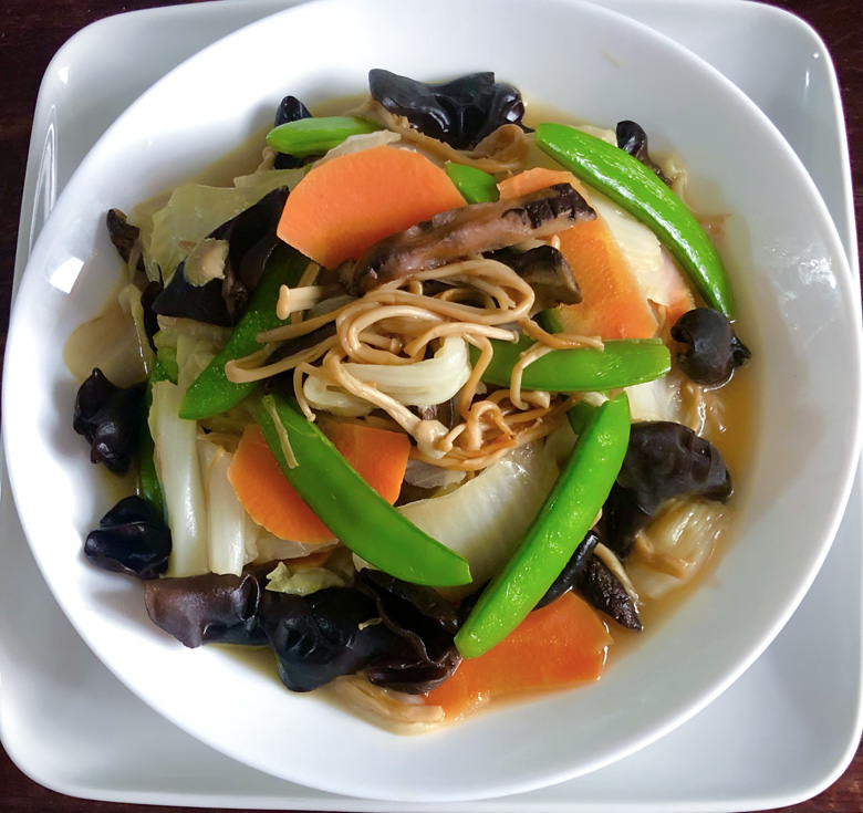 作法:先將木耳泡開,甜豆洗淨摘去兩頭尾,紅蘿蔔切片,包心白菜切片,薑切片,鍋內放香麻油下薑片+香菇+紅蘿葡炒香+包心菜梗先炒軟+木耳+甜豆+少許鹽素毫油一起拌炒至熟即可。