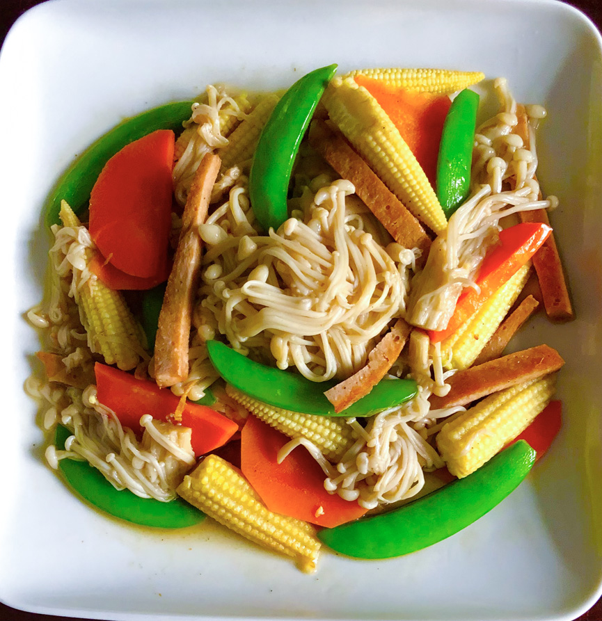 作法:所有材料先洗淨,金針菇切去根部,甜豆去頭尾,玉米筍切斜片,紅蘿蔔切片全部一一川燙撈起備用。鍋內放油素火腿切條下鍋煎香+川燙過的鮮蔬一起下鍋+鹽適量+素毫油兩滴提味拌炒入味即可。