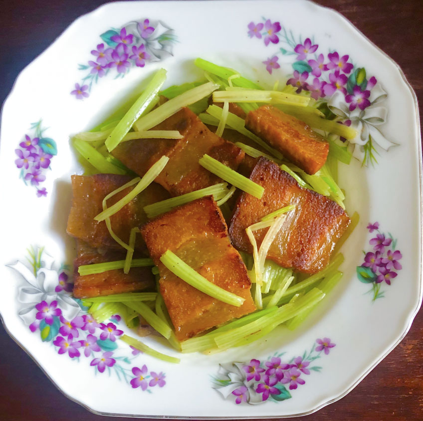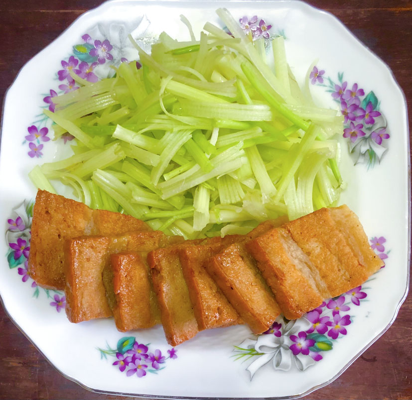 作法:先將芹菜洗淨切段,素三層肉煎香盛起,再將芹菜倒入鍋內炒+胡椒鹽+炒好的素三層翻炒均勻即可。
