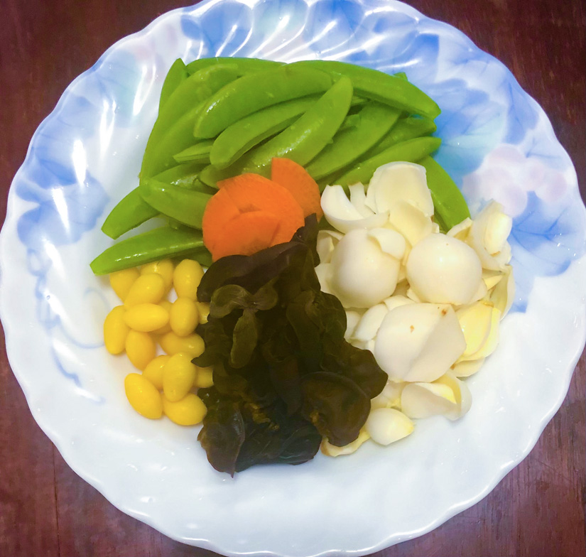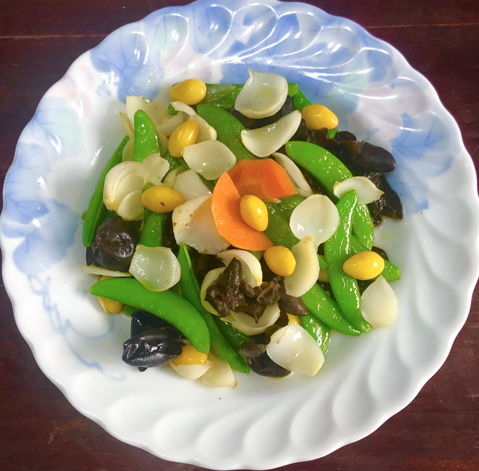 作法:百合剝片,甜豆去頭尾,銀杏洗淨,木耳泡開,全部材料都川燙撈起,鍋內放油把川燙好的材料一起下鍋炒+鹽炒入味即可。