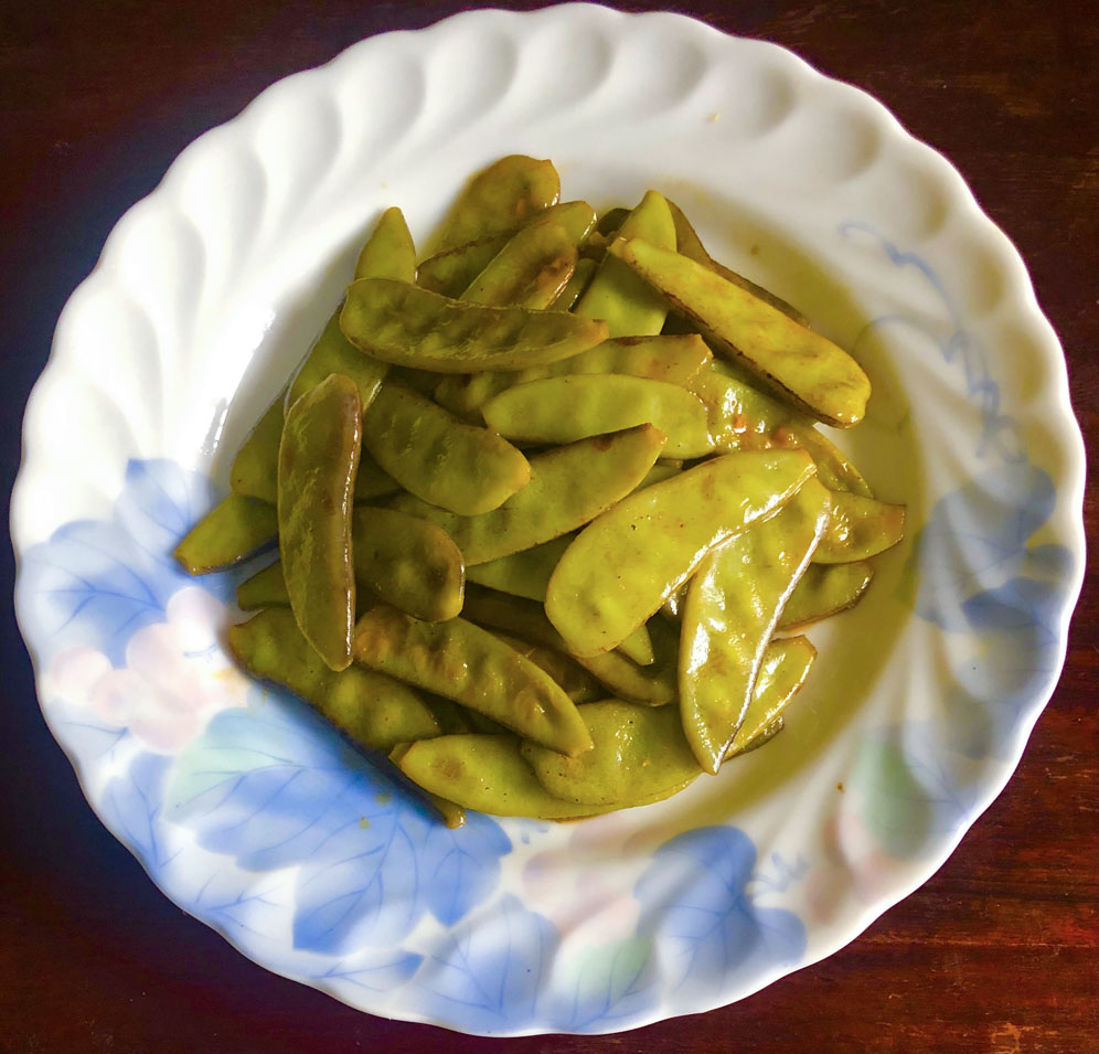 作法:肉豆摘去頭尾洗淨,鍋內放油+薑片+肉豆倒入鍋中炒香+鹽+兩滴素毫油翻炒+水後燜軟即可。