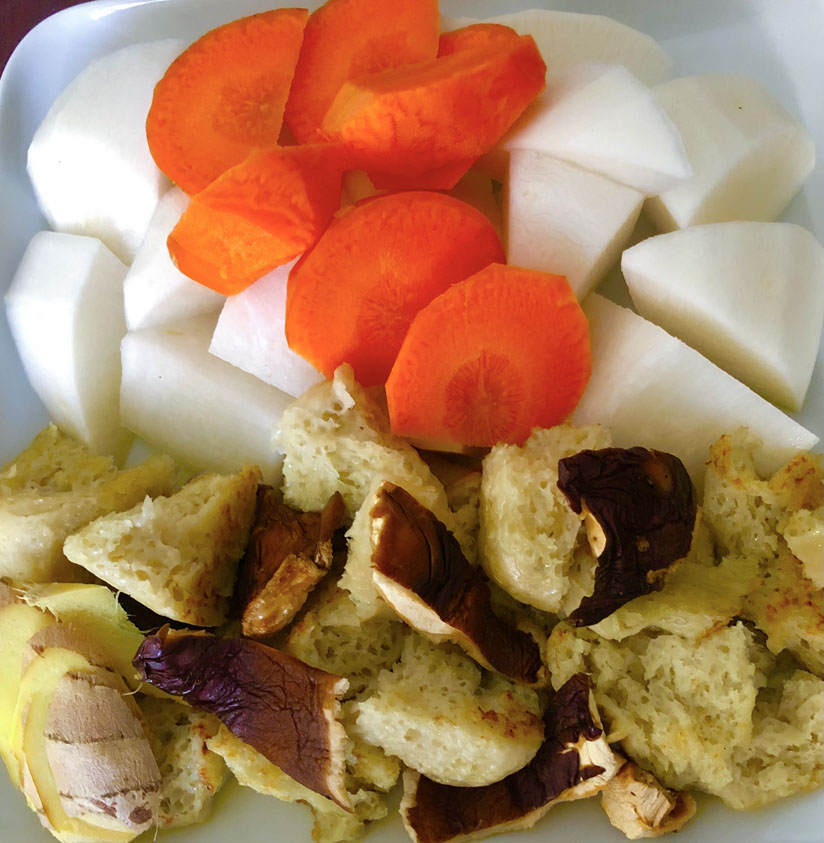 材料:白蘿蔔、紅蘿蔔、烤麩、香菇、薑。