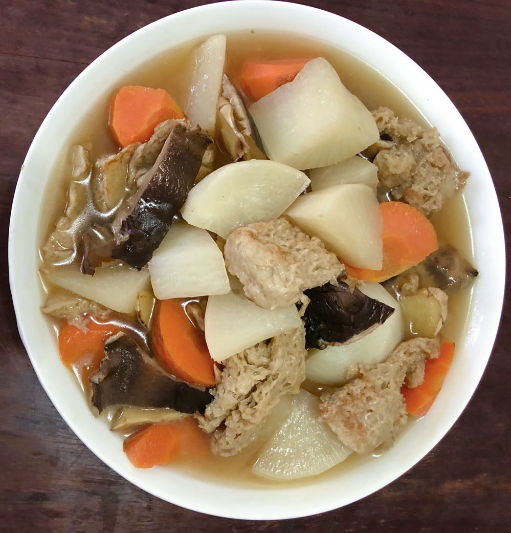 作法:白蘿蔔去皮切滾刀,薑切片番茄切片炒,鍋內放少許油炒薑+番茄炒+白蘿蔔+水煮滾+猴頭菇+皮絲燉煮至蘿蔔熟軟+鹽+胡椒粉即可。