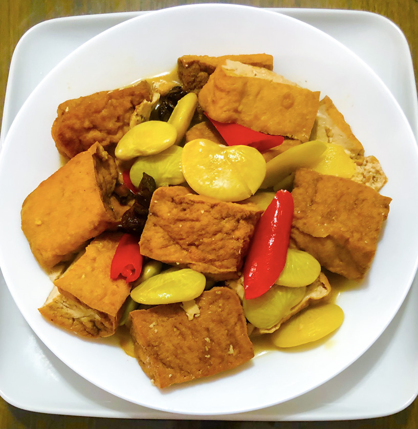 油豆腐燒皇帝豆 Posted on 2022-04-01 by malichuang 回應 材料:油豆腐、皇帝豆、八角、花椒油、素毫油、糖、薑片。作法:先將油豆腐洗淨切半,皇帝豆也洗淨,鍋內放油下薑片,八角+花椒油炒香倒入油豆腐,皇帝豆拌炒+素亳油+些許糖一起炒香+水蓋過菜,煮滾慢火燉至入味即可。