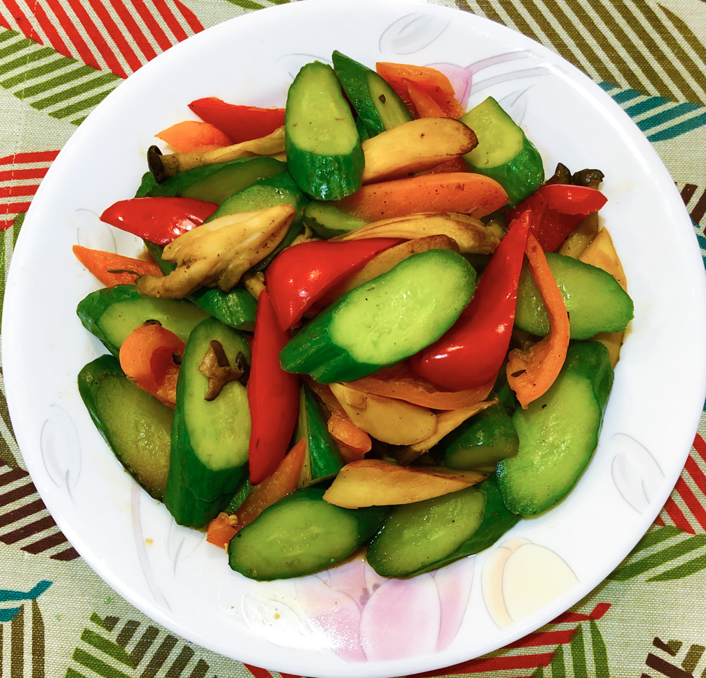 双菇炒鲜蔬 Posted on 2022-04-07 by malichuang 回應 材料:杏鮑菇、鴻喜菇、彩椒、小黃瓜、沙茶醬。作法:把所有材料洗淨,菇菇切斜片,彩椒、小黄瓜切斜片,鍋内放油下双茹炒香+沙茶醬拌炒+彩椒,小黄瓜+素毫油少許翻炒+少許水炒入香即可。
