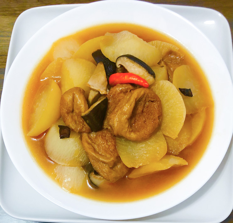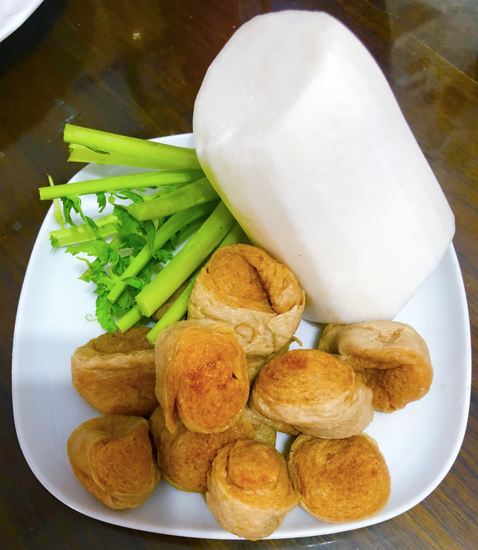 材料:蘿蔔、麵輪、香菇、八角、素毫油。