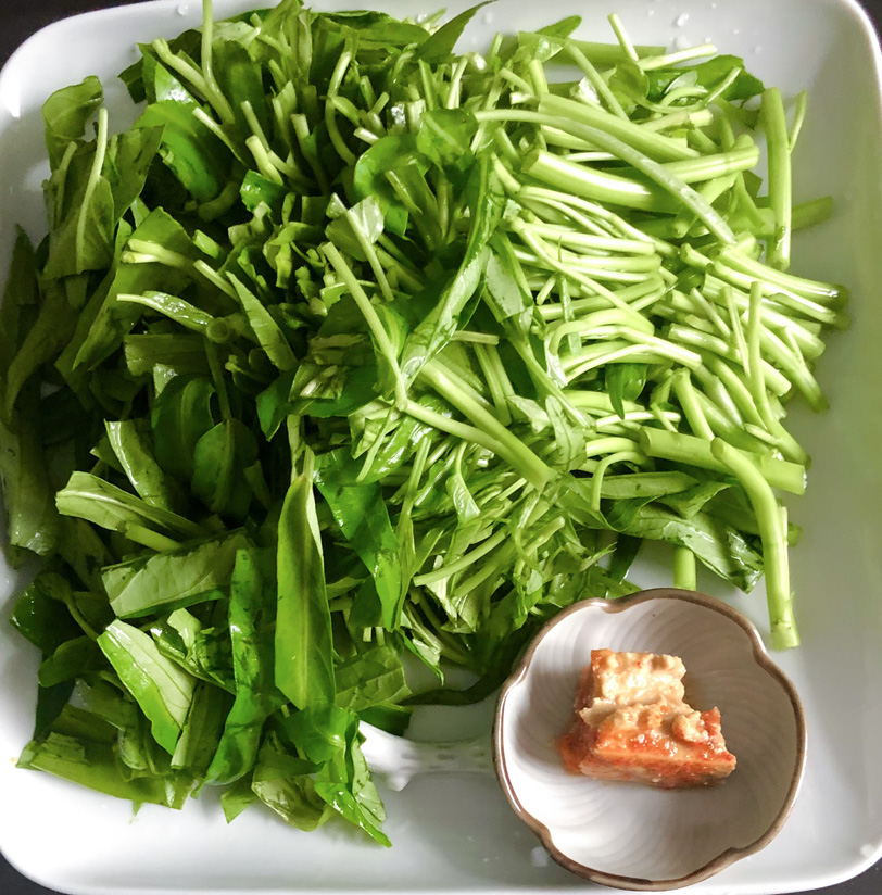 作法:鍋內放油先將辣腐乳壓碎下鍋炒香,空心菜洗淨切去梗的部份葉子切成段下鍋和辣腐乳一起大火拌炒+少許水翻炒起鍋即可。
