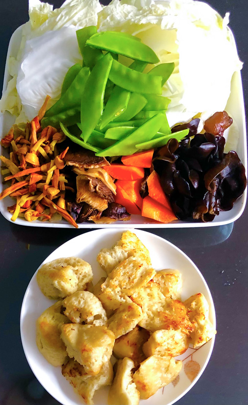 材料:烤麩、大白菜、香菇、木耳、金針、紅蘿蔔、荷蘭豆。