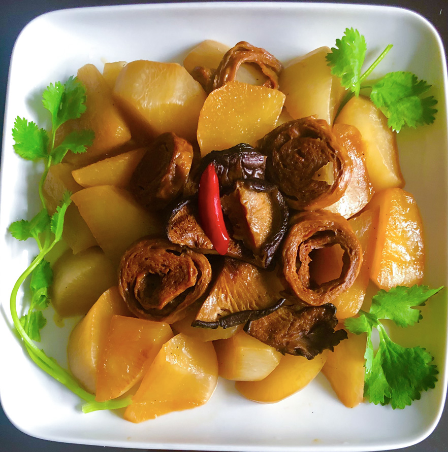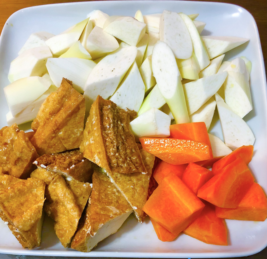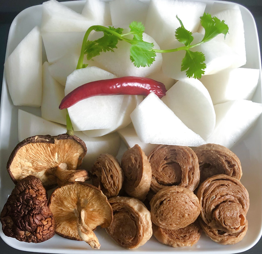 材料:白蘿蔔、麵輪、香菇、八角、素毫油。