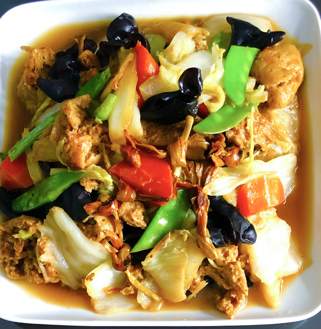作法:先將所有食材洗淨,再將烤麩撕成三片煎兩面黃盛起備用。鍋內放油下香菇煎香+紅蘿葡+木耳+金針炒香+煎好的烤麩+素毫油拌炒至香+水1/3煮入味+大白菜梗拌炒均勻+白菜葉燜煮白菜至熟軟即可。