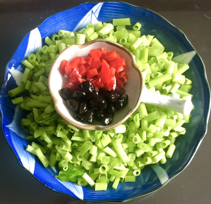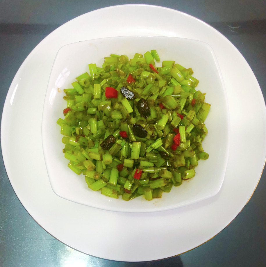 作法:將菜梗切細粒,鍋內放油下豆鼓.辣椒炒+少許糖提豆鼓的味,炒出豆鼓香味+空心菜梗,大火快炒至熟即可食用。