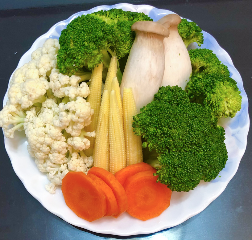 材料:白花椰菜、綠花椰菜、玉米筍、紅蘿蔔、杏鮑菇。