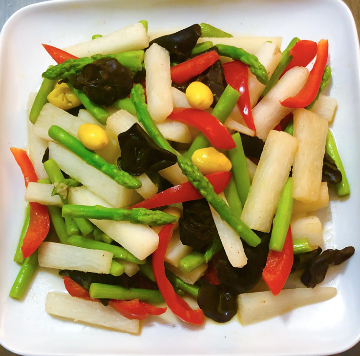 作法:先將木耳泡開,山藥削皮後切條泡水,蘆筍切段,紅椒切條,所有食材都川燙撈起,鍋內放油把所有食材下鍋炒+兩滴素毫油提味+胡椒鹽拌炒至熟即可起鍋裝盤。