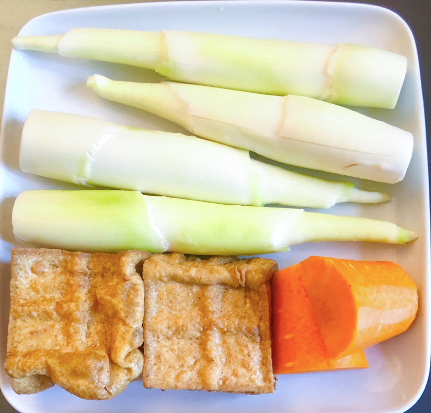 材料:筊白筍、油豆腐、紅蘿蔔、八角。