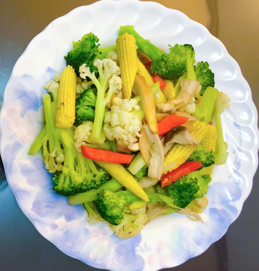 作法:先將所有食材洗淨,杏鮑菇切兩段用撕成條狀備用。紅蘿蔔切條,玉米筍切斜片.花椰菜撕朶,所有蔬菜放入滾水中川燙,白花椰菜最後撈起,鍋內放油下紅蘿蔔煎出紅蘿蔔素+杏鮑菇炒出香味+少許薄醬油+花椰菜、玉米筍+胡椒鹽拌炒入味即可食用。