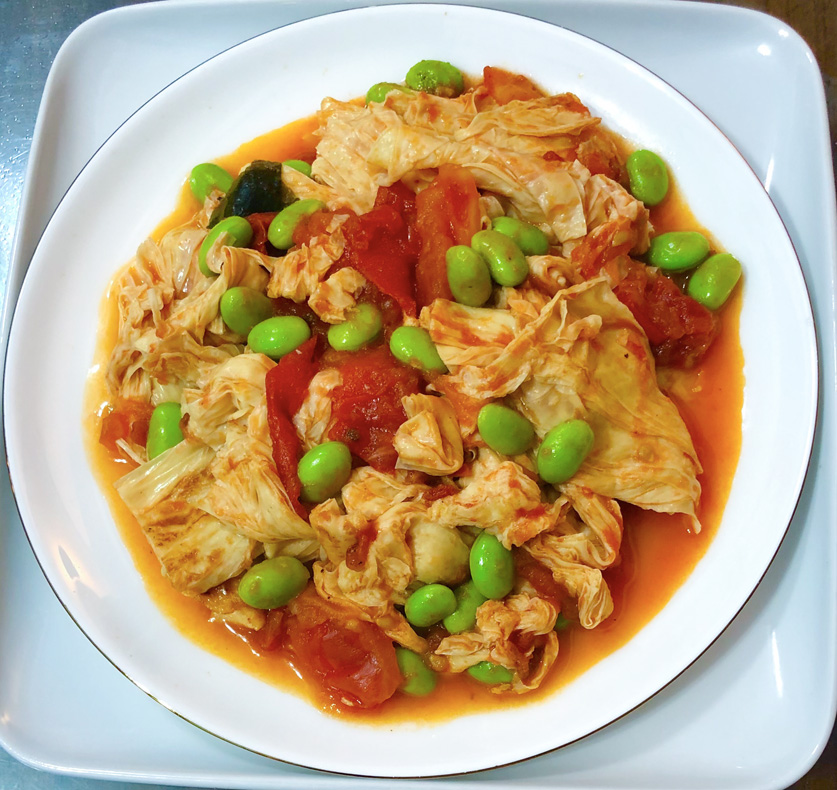 作法:先將豆包打開拉長切成方塊狀,毛豆、番茄洗淨切片,鍋內放橄欖油下番茄炒出茄汁+豆包炒香+少許素毫油+毛豆+素番茄醤+少許水翻炒入味即可。
