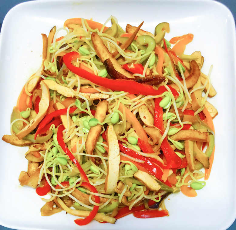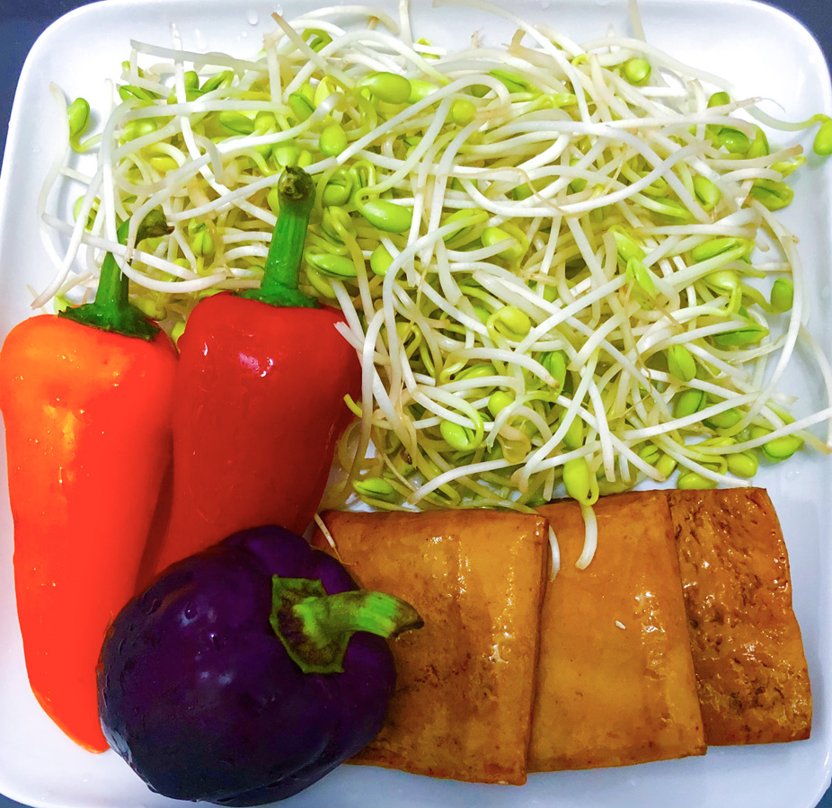 豆芽豆干炒彩椒 Posted on 2022-05-08 by malichuang 回應 材料:黃豆芽、豆干、彩椒。作法:所有食材洗淨,豆干、彩椒切絲,黃豆芽川燙稍軟撈起,鍋內放油下豆干炒香+彩椒拌炒+少許素毫油+川燙好的豆芽+胡椒鹽翻炒入味即可。