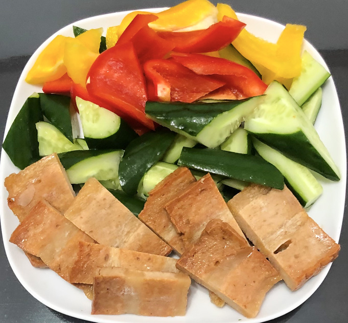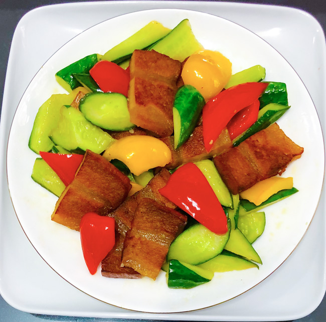 素三層肉炒瓜椒 Posted on 2022-05-08 by malichuang 回應 材料:素三層肉、彩椒、小黃瓜。作法:素三層切片,彩椒切滾刀,小黃瓜切小滾刀用少許鹽抓一下,鍋內放油下素三層肉煎香剩起備用,再將彩椒小黃瓜放入鍋中炒香+少許薄醬油拌炒+煎好的素三層翻炒即可。