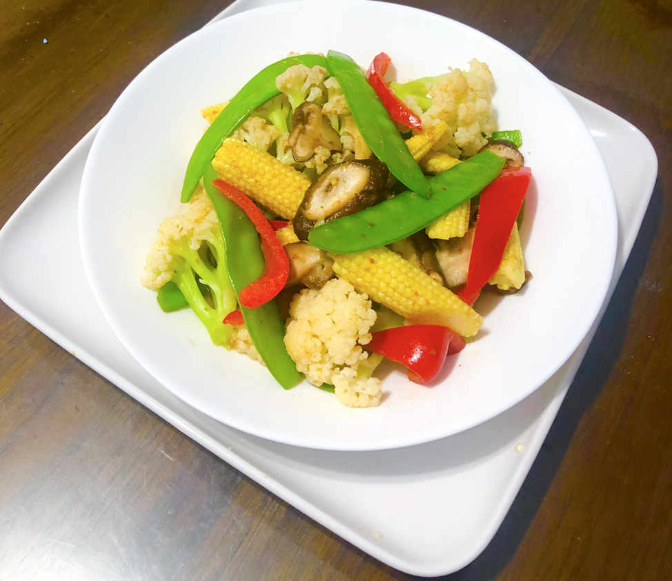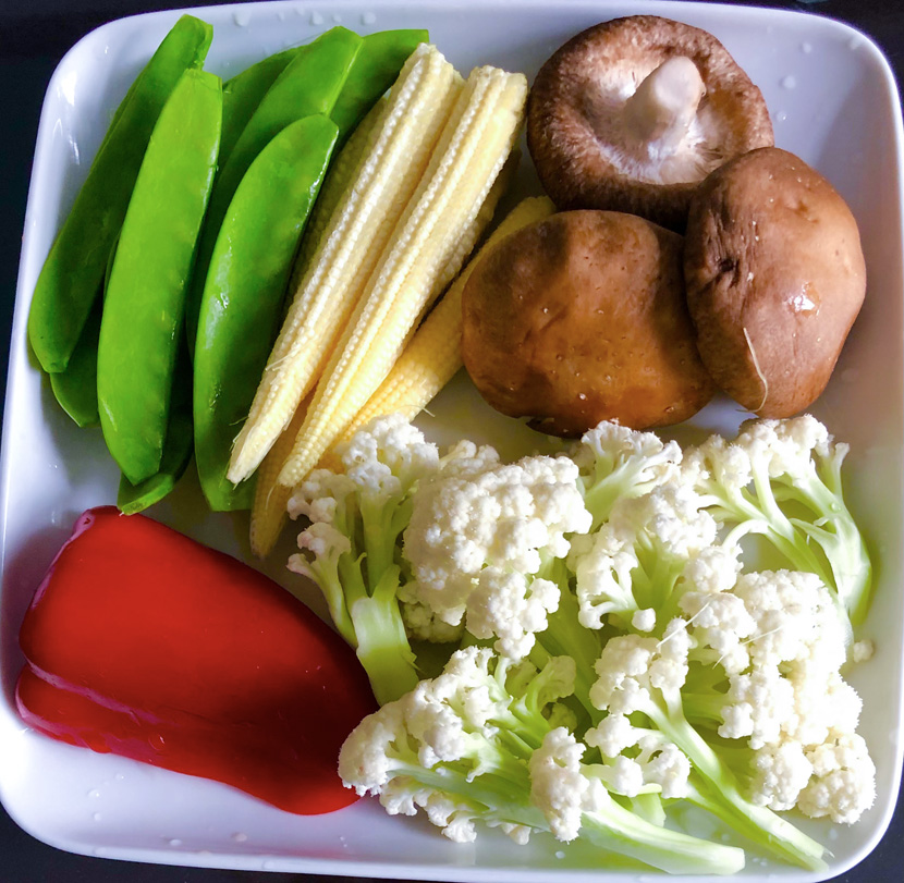 材料:白花椰菜、荷蘭豆、紅椒、玉米筍、生香菇、沙茶醬。