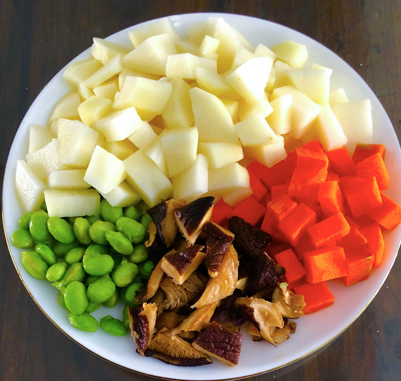 材料:馬鈴薯、紅蘿蔔、毛豆、香菇、豆瓣醬。