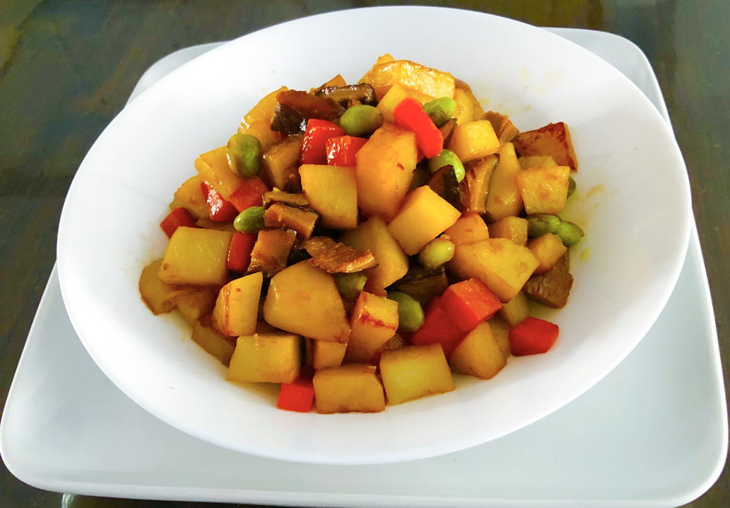 作法:毛豆洗淨,其他食材都切丁,鍋內放油先將香菇炒香盛起備用。鍋內再放些油下馬鈴薯紅蘿蔔煎香+豆瓣醬+素毫油+糖拌炒+炒好的香菇+毛豆翻炒+水燜熟馬鈴薯即可。