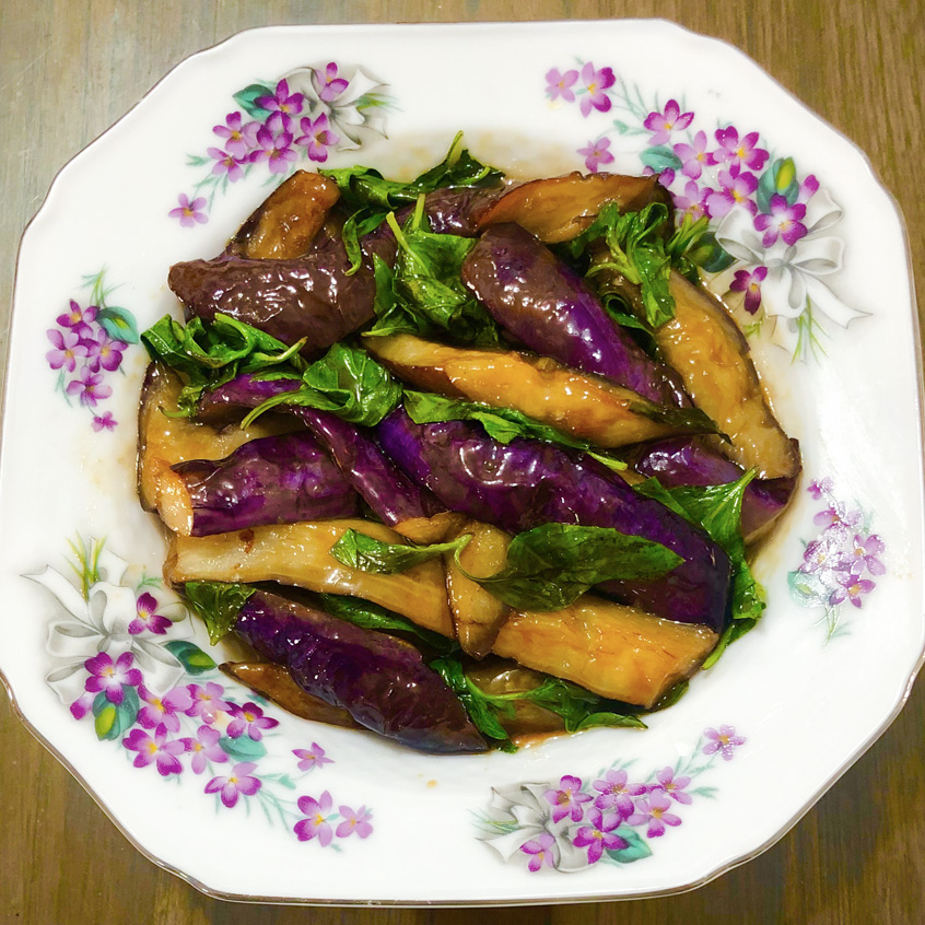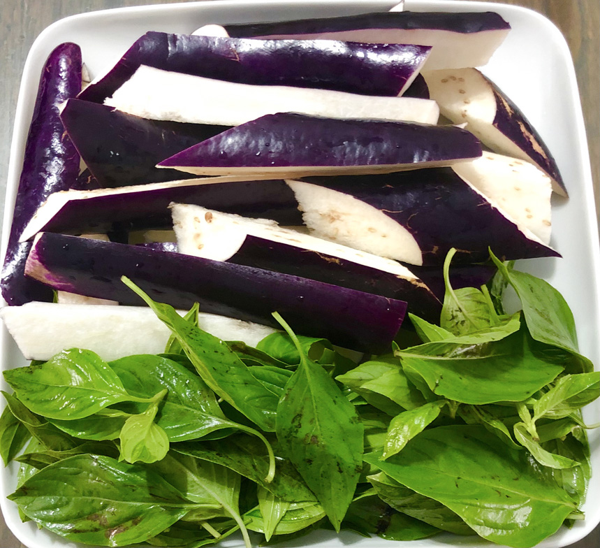 作法:食材先洗淨備用,茄子切長條狀 (一切四片)+芡粉及麵粉各一茶匙拌勻,鍋內放油下茄子,背先朝下煎再反面煎熟+素毫油+烏醋+甜辣醬拌炒+九層塔拌勻即可起鍋食用。