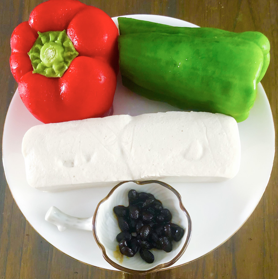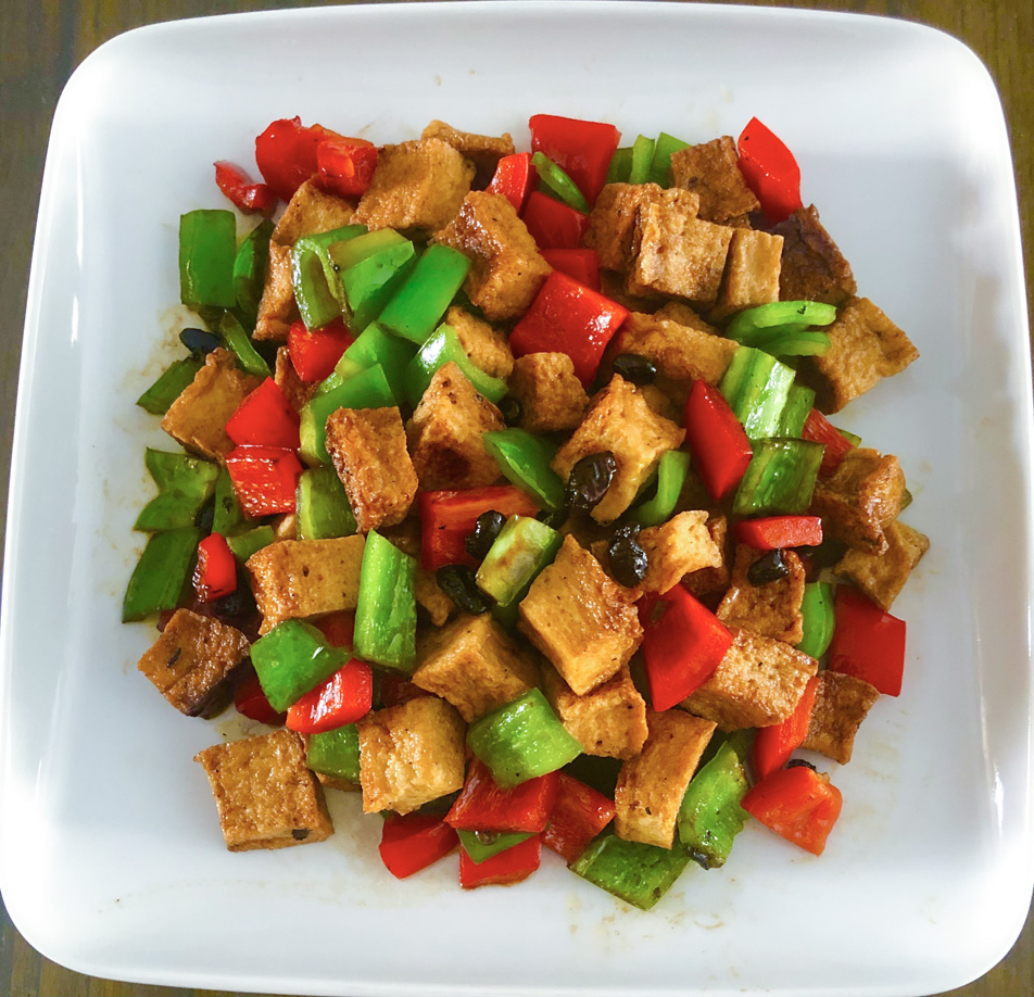 作法:先將食材洗淨,百頁豆腐切大丁,青紅椒切中丁,鍋內放油下百頁豆腐煎兩面黃後盛起備用,鍋內再稍加點油下豆鼓+少許砂糖爆香+少許素毫油+煎好的百頁豆腐+水,一起拌炒+青紅椒一起翻炒至熟即可。