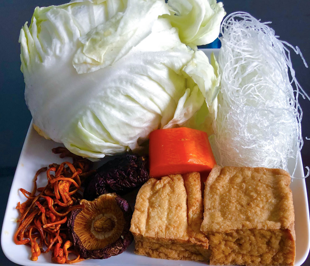 材料:包心白菜、紅蘿蔔、粉絲、油豆腐、香菇、蟲草菇、薑。