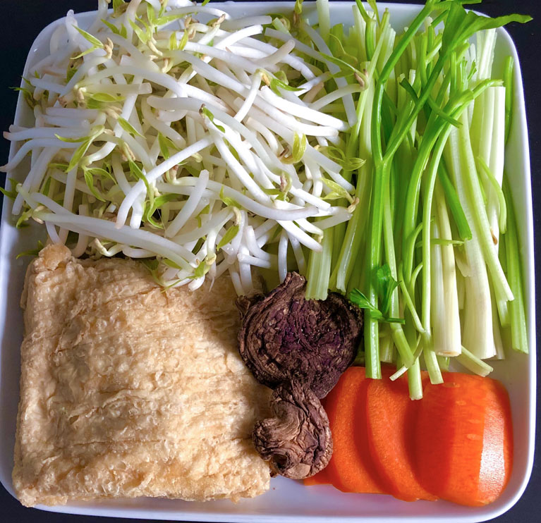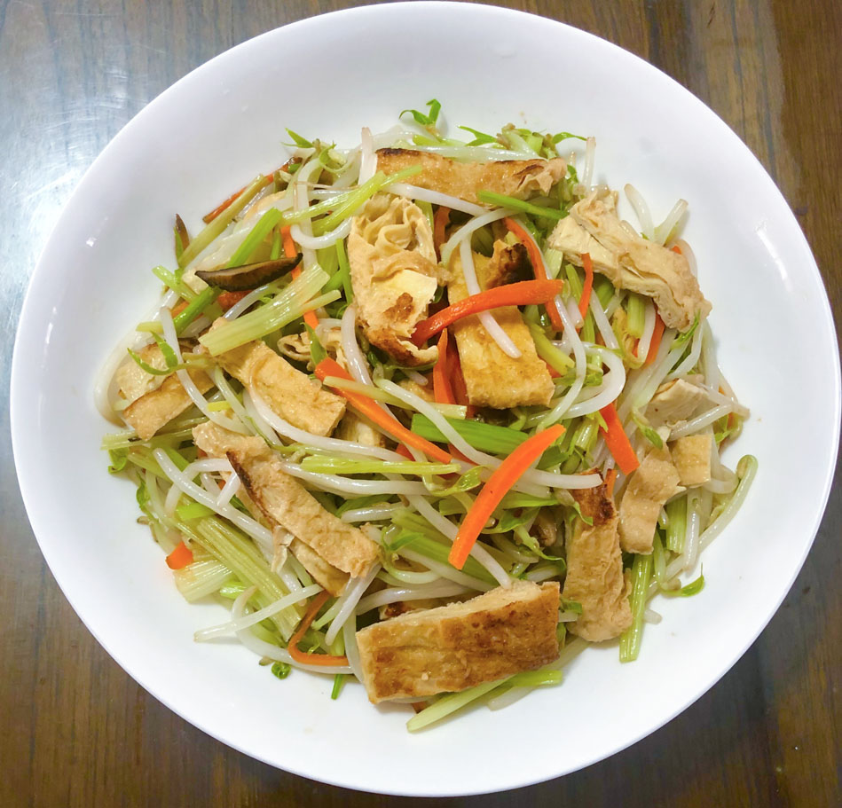 材料:芹菜、豆芽、紅蘿蔔、豆包、香菇。