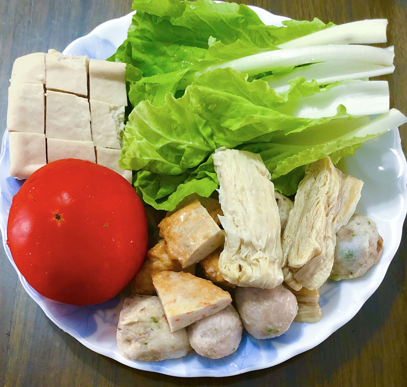 材料:凍豆腐、番茄、素丸子、豆包、甜不辣、小白菜。