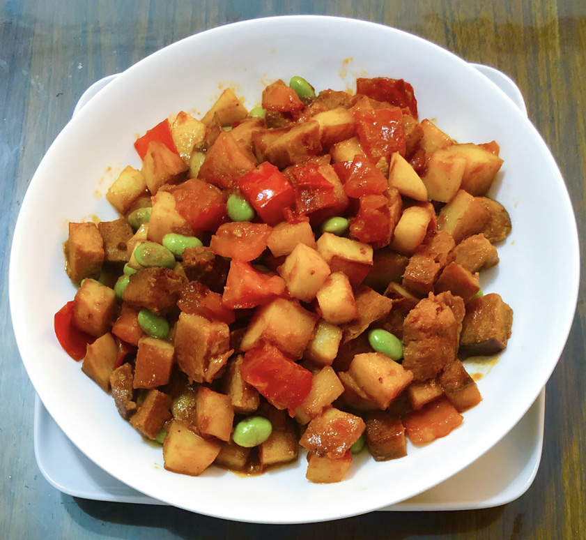 作法:先將素幾肉切丁入鍋煎香盛起備用,再將馬鈴薯切丁放入油鍋中煎香盛起備用,最後番茄切丁放入鍋中+沙茶醬炒至番茄軟,再將已煎好的素幾+馬鈴薯+毛豆+素毫油+番茄醬拌炒+加適量水煮熟馬鈴薯,撒上少許黑胡椒粒 (可以先壓碎) 攪拌均勻即可。
