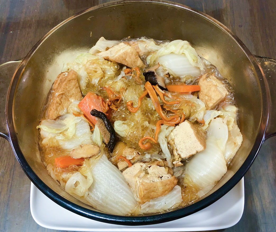 作法:白菜洗淨剝成片,紅蘿蔔切片,香菇切條狀,油豆腐對角切成四塊,薑切片絲,粉絲泡軟,鍋內放油下薑片炒香+紅蘿蔔炒出紅蘿蔔素+少許鹽+白菜梗炒香+素毫油提味,倒入燉鍋中+油豆腐+蟲草菇+粉絲+白菜葉+水蓋上鍋蓋燉煮入味+少許胡椒鹽拌一下即可起鍋。