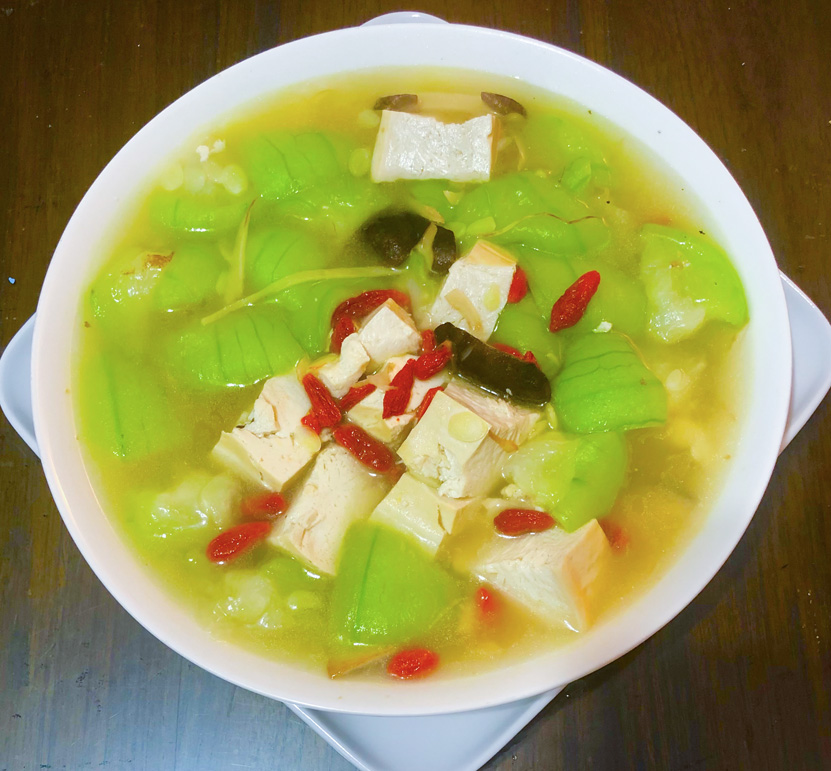 材料:絲瓜、凍豆腐、枸杞子、生香菇、嫩薑。