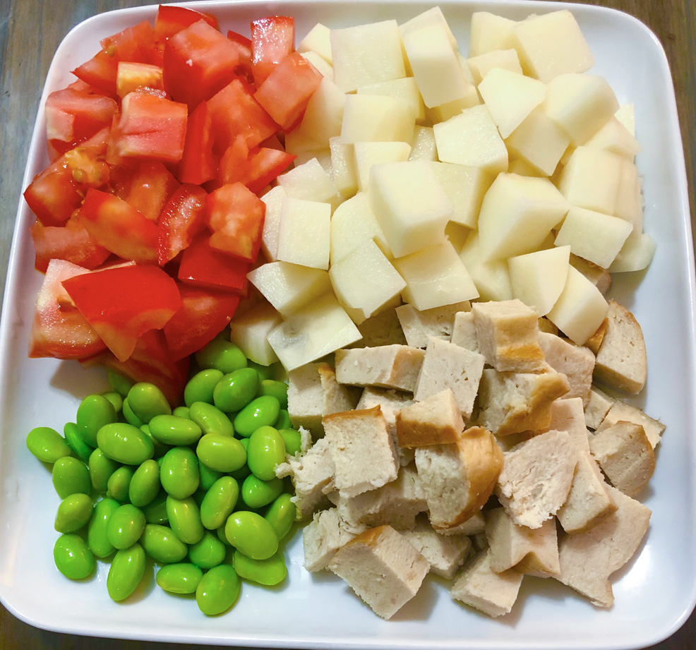 材料:馬鈴薯、番茄、毛豆、素幾肉、沙茶醬、番茄醬、黑胡椒粒