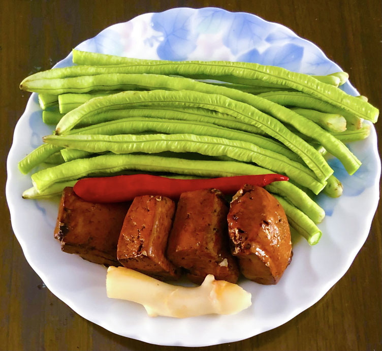 材料:長豆、五香豆干、薑、辣椒、豆瓣醬、甜麵醬。