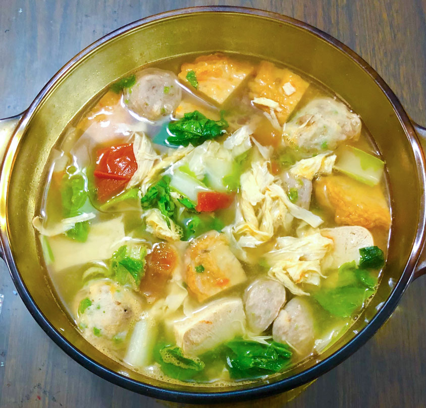 作法:凍豆腐切塊,番茄切小塊,豆包切條,素丸子切半,甜不辣對切成四塊,小白菜切小段。湯鍋放水凍豆腐、番茄煮開+其他配料煮滾之後+味噌調味+小白菜煮開即可食用。